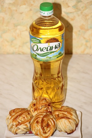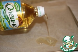 Противень застилаем пекарской бумагой. Смазываем маслом. Выкладываем фарш в тесте на противень. Тщательно смазываем тесто желтком.
