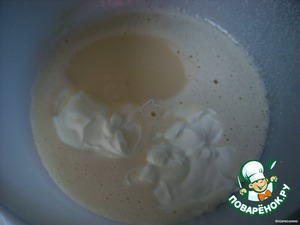 Яйца растереть с сахаром, добавить сметану, сгущенку, муку, перемешать, разделить на 2 части, в одну добавить какао.