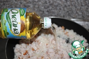 Добавьте сырой рис. Перемешайте рис так, чтоб масло полностью разошлось по рису и буквально каждая рисинка покрылась маслом. Добавлять его больше в сковороду не будем. -