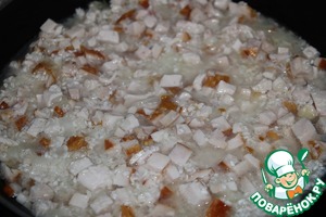 Добавьте нарезанную грудинку к луку. Обжарьте 3 минуты.