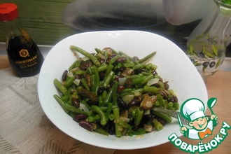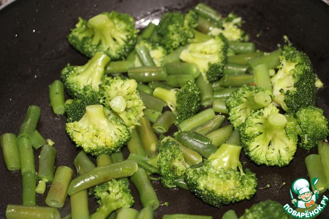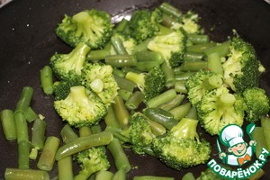 Грибы вынимаем, а в этом же масле обжарим брокколли и стручковую фасоль, предварительно отварив их в подсоленной воде в течение 2 минут. Обжариваем на сильном огне, чтобы капуста и фасоль хрустели.