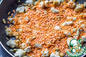 Засыпаем чечевицу в сковороду, обжариваем 2-3 минуты, помешивая. Добавляем 1 стакан воды и томим на небольшом огне 10-12 минут. Солим и перчим в процессе готовки. Начинка должна быть довольно сочной с небольшим количеством жидкости.