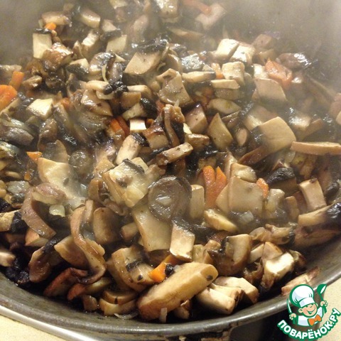 Пока варится бульон готовим зажарку. Грибы промыть, порезать на небольшие кусочки. В большой сковороде нагреть растительное масло, обжарить кубиками нарезанную морковь до золотистого цвета, затем добавить мелко нарезанный лук и жарить до мягкости лука. Теперь сюда добавляем порезанные грибы и жарим пока не испарится почти вся жидкость