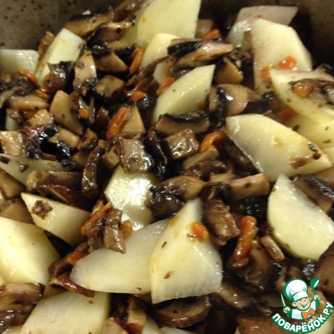 Пока жарятся грибы, чистим и режем небольшими кусочками картофель. Добавляем его в зажарку и тушим 5 минут