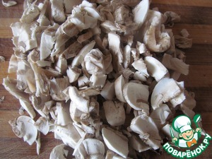2. Теперь займемся начинкой. Отвариваем рис, варю до готовности, так как время варки в голубцах небольшое, и он может остаться сырым. Мелко нарезать грибы (в этот раз брала шампиньоны, делала с сушеными белыми, тогда их отвариваем, а затем обжариваем) обжарить их с 1 мелко нарезанной луковицей.