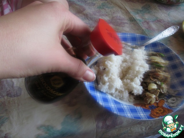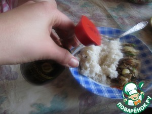3. Смешиваем рис, грибы, добавить соевый соус Kikkoman 1 ст. л., соль, перец по вкусу.