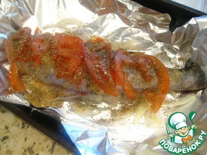Оставляем ее минут на 20, а в это время тонко режем помидор и лук полукольцами. Горчицу смешиваем с лимонным соком. Делаем неглубокие надрезы на рыбе и в каждый надрез вставляем помидор. Выкладываем лук на фольгу, на него судака. Поливаем судака горчичным соусом, выкладываем остатки помидора, перчим и приправляем орегано.