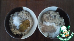 Разделяем горохово-ореховую массу на две части. В одну гороховую часть добавляем соль, смесь специй (куркума, кардамон). В другую гороховую часть добавляем корицу, сахар.