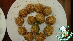 Все перемешиваем. Формируем из массы шарики, диаметром 3 см. Соленые гороховые орешки обваливаем в кунжуте.