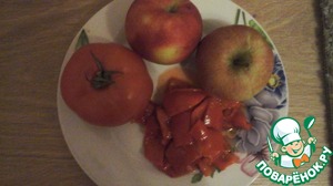 Займемся соусом. Очищеные яблоки, помидор и перчик взбиваем в блендере до однородной массы. Добавляем соль, перец черный, ложку воды и варим минут 5 на медленном огне до загустения.