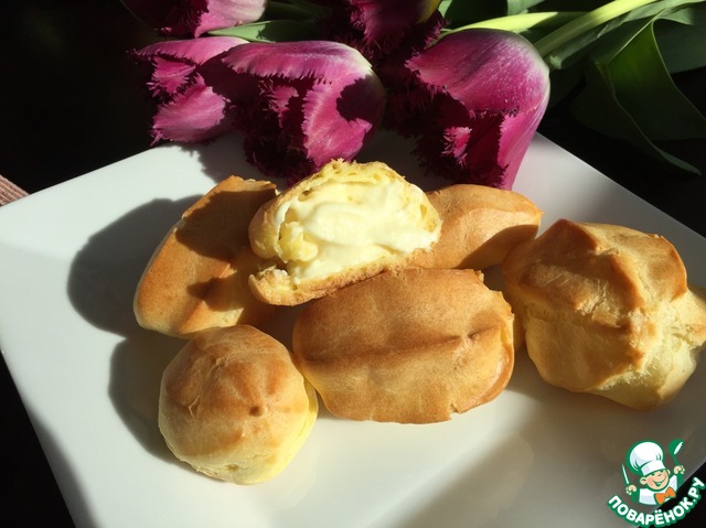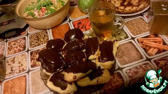 Начиняла просто заварным кремом и до шоколадной глазури руки не дошли, но улетели вкусняшки за два дня)