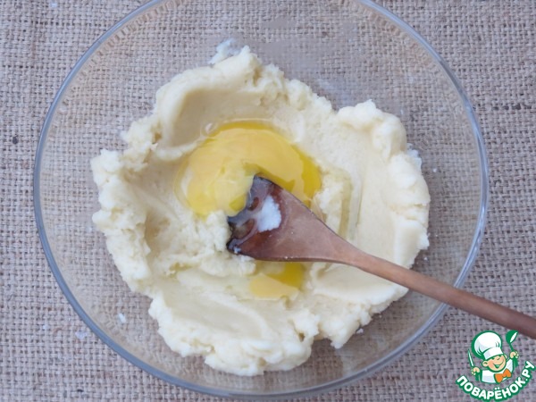 Когда тесто полностью остыло, добавить 1 яйцо и хорошо перемешать и только потом добавить второе яйцо, перемешать и добавить третье, перемешать и добавить четвёртое.
