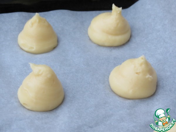 При помощи кулинарного мешка сформировать маленькие пирожные, оставить хороший промежуток между ними.