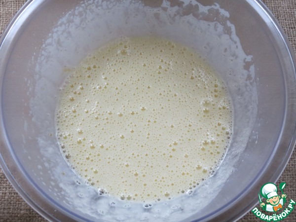 взбить яйца с сахаром и крахмалом, примерно 10 минут /объём должен увеличиться в 3 раза/.