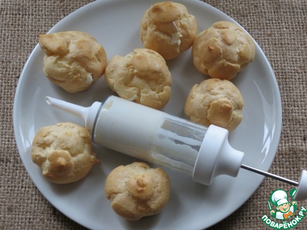 При помощи кулинарного шприца /с узкой насадкой/ заполнить профитроли кремом.