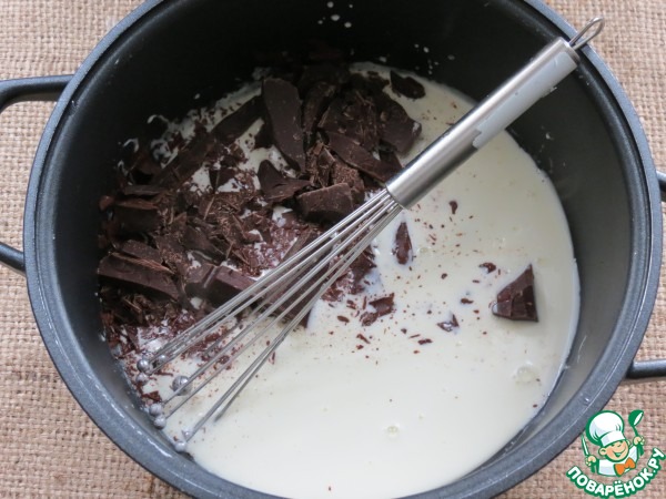 Подогреть, не доводя до кипения, сливки с молоком, добавить рубленый шоколад, перемешивая, довести до однородной массы.