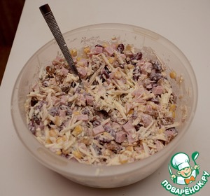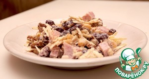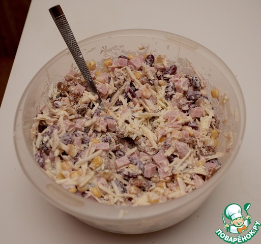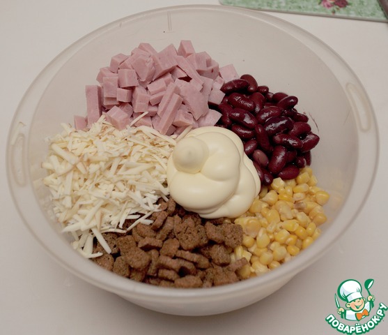 Вкусный и сытный салат из красной фасоли и сыра. Прост в приготовлении и на любом празднике идет на УРА. Видела здесь несколько похожих рецептов, но в таком исполнении не нашла. Пробуйте, не пожалеете!
