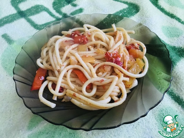 Как перец обжарился, добавляем отваренную пасту и кетчуп по вкусу, все хорошо перемешиваем, прогреваем еще минуты 2.