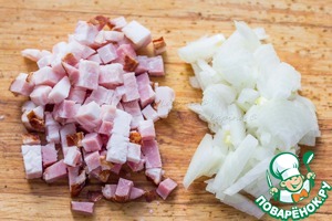 В блендере смешаем фасоль с небольшим количеством воды, в которой она варилась. Добавим грудинку с луком и сливочный сыр.