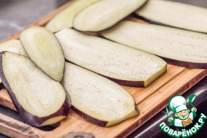 Баклажаны нарежем на пластинки, присыпаем солью и оставляем на 15 минут.