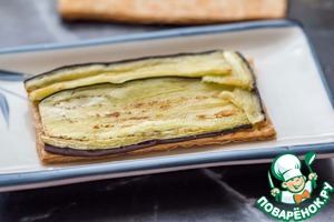 Собираем мильфей. На один пласт готового теста выкладываем в один слой баклажанов.