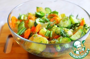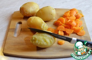 Картофель и морковь отварить до полной готовности. Очистить от кожицы и порезать, в горячем виде. Сразу переложить в миску.