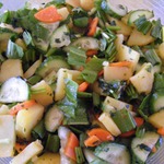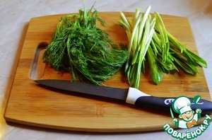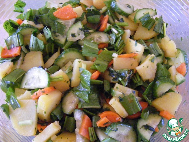 Порубить черемшу и укроп, выложить в миску к овощам.