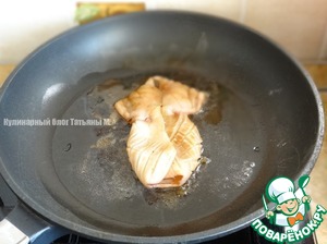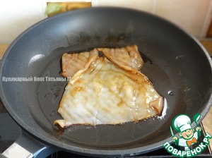 На раскаленной сковороде на масле поджарить кальмара надрезами вниз в течении 1 минуты;