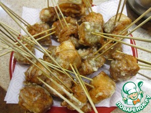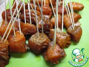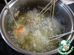 Чтобы было удобнее, куски форели я надеваю на деревянные палочки. Это делает работу с раскаленным маслом более безопасной.