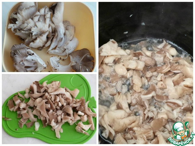 Грибы хорошо промываем и нарезаем кусочками и отправляем обжариваться, я использую мультиварку, можно готовить все тоже самое в казанке. Выставляю режим "Жарить" на 15 минут.