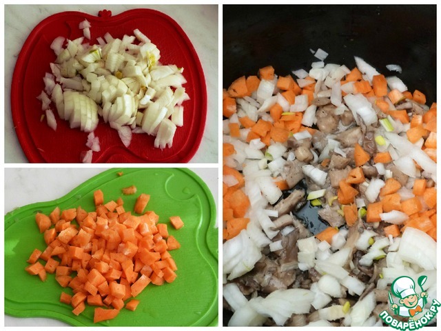 Тем временем режем кубиками лук и морковь, и отправляем к грибам. В мультиварке готовим до конца программы. Обязательно помешиваем.