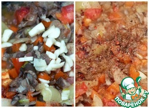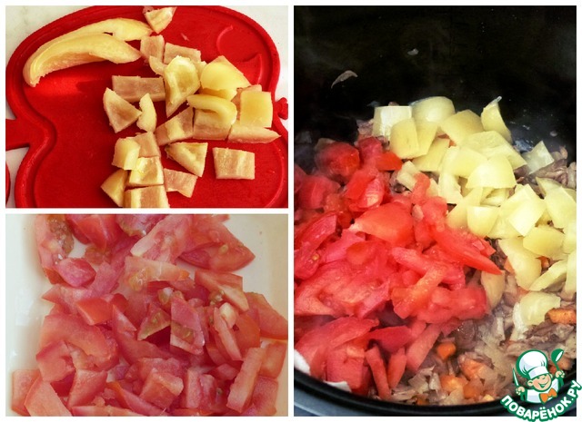 Режем перец и помидор кубиками. В мультиварке ставим режим "Жарить" еще на 10-15 минут и отправляем помидоры и перец к грибам. Готовим до конца программы.