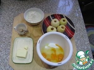 Необходимые продукты. Сахар с яйцами, очищенные от кожи и семян яблоки, просеянная мука, смешанная корица с сахаром для посыпки и сливочное масло.