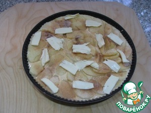 Нарезать тонкими ломтиками охлажденное сливочное масло (70г) и разложить сверху слоем на яблоки (если не хватит масла, добавьте, все зависит от диаметра формы. Сегодня в этой форме у меня ушло чуть больше. )