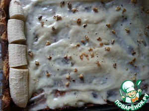 Бисквит промазать тёплым кремом, посыпать рубленными грецкими орехами. В край бисквита выкладывает банан и закручивает в рулет