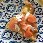 Достаем аккуратно лопаткой наш пудинг. Из лосося делаем "розочки", поливаем соусом.