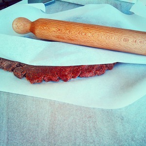 При помощи скалки и пергамента, расскатать тесто /5мм/.