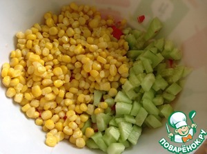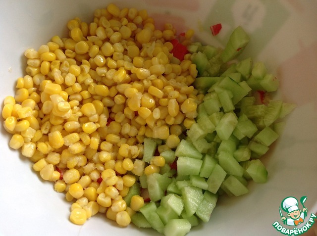 • Крабовые палочки нарезать кубиками, огурцы очистить и нарезать так же, как и палочки.