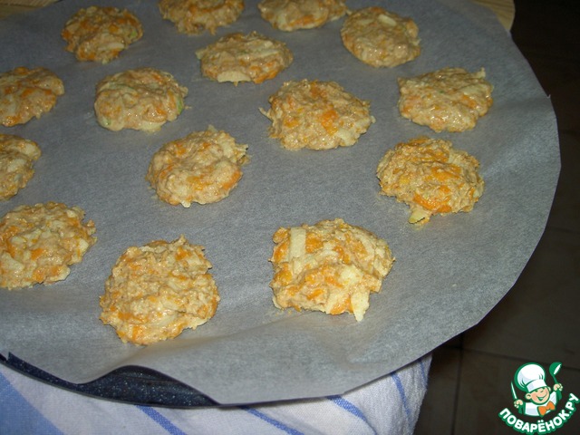 • На застеленный бумагой противень столовой ложкой, смоченной в воде, выкладываем небольшие лепешечки из нашего теста и выпекаем примерно при 180 градусах 18-20 минут