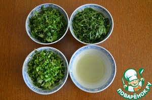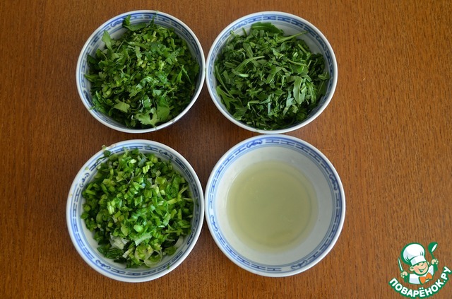 6. Пока готовится курица, мелко порезать зеленый лук, рукколу и кинзу. Выжать сок из лайма.