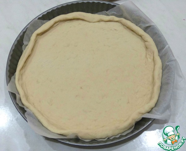 Раскатываем большую часть теста, толщиной 1-1,5 см. Выкладываем тесто в форму, можно использовать бумагу для выпечки. Формируем небольшие бортики. У меня форма диаметром 30 см.