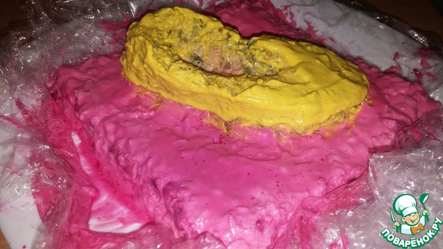 Выложить слой тертого сыра, через края пищевой пленки уплотнить салат и придать "подушке" желаемую форму. Смазать розовым соусом