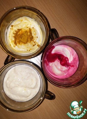Смешать сметану с горчишным порошком перцем и солью. Разделить соус на 4 равные части.