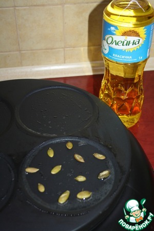 Я готовила оладьи на блиннице. Итак, смазываем маслом блинницу. Выкладываем семечки тыквы (по желанию), сверху - тесто, разравниваем лопаточкой.