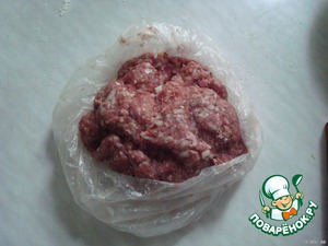 Подготовить фарш, смешав его с мелкопорезанной 0,5 луковицей, чесноком, посолив и поперчив.