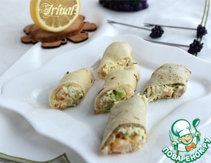 4. На блинчики разложить начинку, свернуть их трубочками, порезать на ровные кусочки, подавать можно как холодными так и горячими.