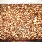 • Слегка горячий пирог поливаем медом и равномерно распределяем его. Сверху пирог посыпаем измельченным фундуком.