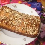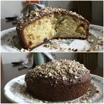 У меня, как и у многих, опал кексик. Пекла его, пекла, температуру снижала, время увеличивала, все равно получился слишком влажным внутри, короче - не пропекся... Орешки не хотели держаться на макушке, ссыпались при нарезке и поедании...