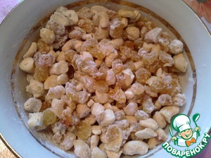 Орехи кешью порубите, смешайте с ложкой муки и изюмом.