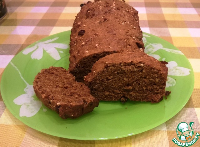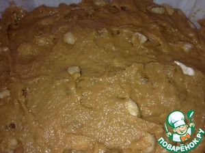 Добавьте в тесто орехи с изюмом. Выложите тесто в форму, застеленную пергаментом. У меня форма размером 22x16x5 см. Выпекайте в духовке 50 минут при 170 градусах.